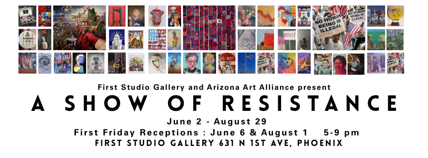 A Show of Resistance is more than an exhibition—it’s a movement. Hosted in the iconic First Studio building—Arizona’s first radio and television studio and now a creative hub in the heart of downtown Phoenix—the show reflects a deep commitment to curating thought-provoking, socially conscious art. First Studio Gallery is a collaborative curatorial effort led by Kristine Kollasch, alongside Ellen Nemetz, Marnelle North, and Tess Mosko Scherer.