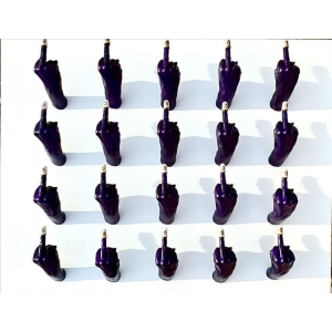 “A Woman’s Work is Never Done” features 20 female hands-each giving the middle finger while wearing a commemorative thimble with the portrait of a U.S. First Lady. The purple color symbolizes royalty and power, reclaiming dignity in the face of historical dismissal. The thimble (symbols of domestic labor), are to be worn on the middle finger to perform “women’s work”. This installation challenges how society has traditionally confined and commemorated women; even the most visible in American history.