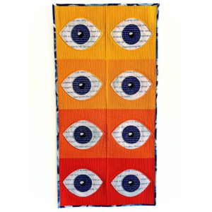 Eye Spy a Narcissist is an exploration of the layered dynamics of narcissism through the use of eyes (a symbol of perception, reflection and self-obsession). Each eye is filled with fragments of original text printed using cyanotype from a conversation with a narcissist. The one sided conversation captures the manipulative and self-centered rhetoric. Within each pupil, a repeat reflection echoes the words “mememe.” The tactile softness of the piece contrasts with the harshness of the theme; a psychological epidemic that has become a prominent part of our society in America.