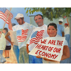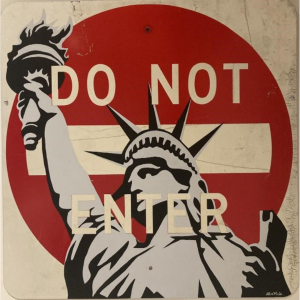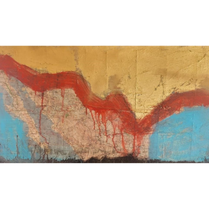 My pieces for this show are visual language to express the immigration to America and the push back against the repressive administration. In my work Land of MIlk and Honey I used gold leaf to represent the vision a migrant may have of the US. The red painted southern border is a reference to the cruel reception they may have when reaching there.The Light in the Darkness is the way I think of those who resisted authoritarians in Nazi Germany. Fanning the flames of a vision of how things should be and pushing back against Fascists is also needed in the current state of the US.