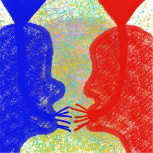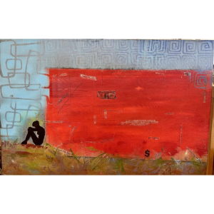 This art was created from a song I wrote. It represents how life, in this current political climate ignites fear, represented by the cavernous wood and sharp barbed wire. It is hard to keep trying to traverse through it, at some times with no avail. The fear becomes a chink in the armor of our own mental courage…questioning our own sanity represented by the panicking person. Creating this mixed media piece gives me a place to put my fear and anxiety, resisting its consuming nature.