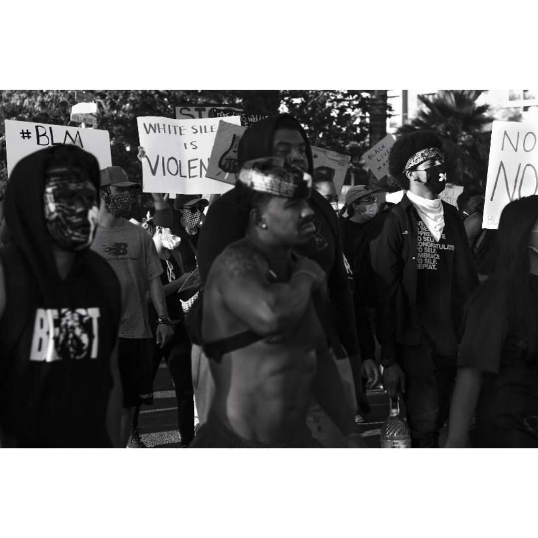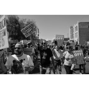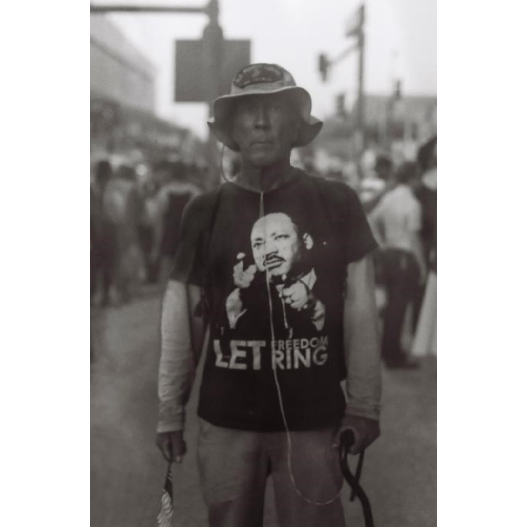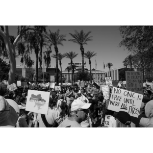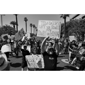“These pieces show their resistance in very different ways. There is quiet, subdued, long served resistance. And there is also strong, fierce, active resistance. Both powerful, both needed to fight the fight. The presence of both is impactful. From a Veteran lowly holding an American flag ,while lost in a stare; wearing the shirt of a man who lost his life in his own fight for freedom.To the young black men, who march proudly on the capitol, to stand for all the injustice, hate and murder the black community has been dealing with for years and years. And finally a moment caught perfectly, just as the crowd raises their fists in solidarity, as a police helicopter flies by.All these photos show how our local Phoenix community comes together to stand for the justice they deserve.”