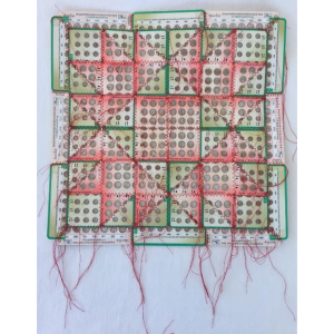 My artistic identity is that of a collector and gatherer. I think of my creative process as a journey that began long ago. I am traveling through life picking up bits and pieces of memories, items, places, and people along the way: all affecting my work. I concentrate on the accumulation of these things and incorporate multiples and repetition in my work. I am drawn to patterns, grids, maps, numbers, calendars, and mathematical manipulations for inspiration. I examine the ideas of micro and macro within the arrangements of my collections. My work is unique in that I often use materials that people throw out, such as a list, a tiny object in your pocket, or something I find on the ground like an old shoe tread. I create strong overall designs to draw viewers in from a distance, but love to incorporate small details that are discovered upon closer inspection.