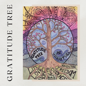 From there, the tree grows upward as participants paint the trunk, branches, and leaves, adding words of gratitude throughout the composition. The process encourages quiet reflection, intention, and a sense of inner steadiness while offering plenty of room for personal interpretation and creativity.
